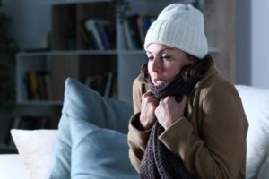 image of a cold adult woman covered with clothes freezing sitting on the sofa depicting running out of home heating oil October 26, 2022