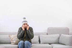 Young man wearing warm clothes freezing on sofa at home depicting furnace turns off after reset August 29, 2025