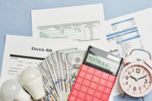 Monthly utility bills with currency bills, calculator, and alarm clock